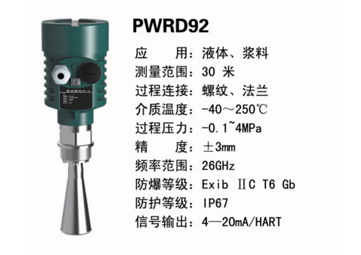 雷達液位計天線發射出極窄的微波脈沖,這些脈沖以光速穿過空間,與被測介質表面相遇,其部分能量被反射回同一天線接收。發射和接收脈沖之間的時間間隔與天線到被測介質表面的距離成正比。由于電磁波傳播速度極高,發射脈沖與接收脈沖之間的時間間隔非常小(納秒級),難以確定。PWRRD92雷達液位計采用一種特殊的解調技術,可以準確識別發射脈沖與接收脈沖之間的時間間隔,從而進一步計算天線與被測介質表面的距離。